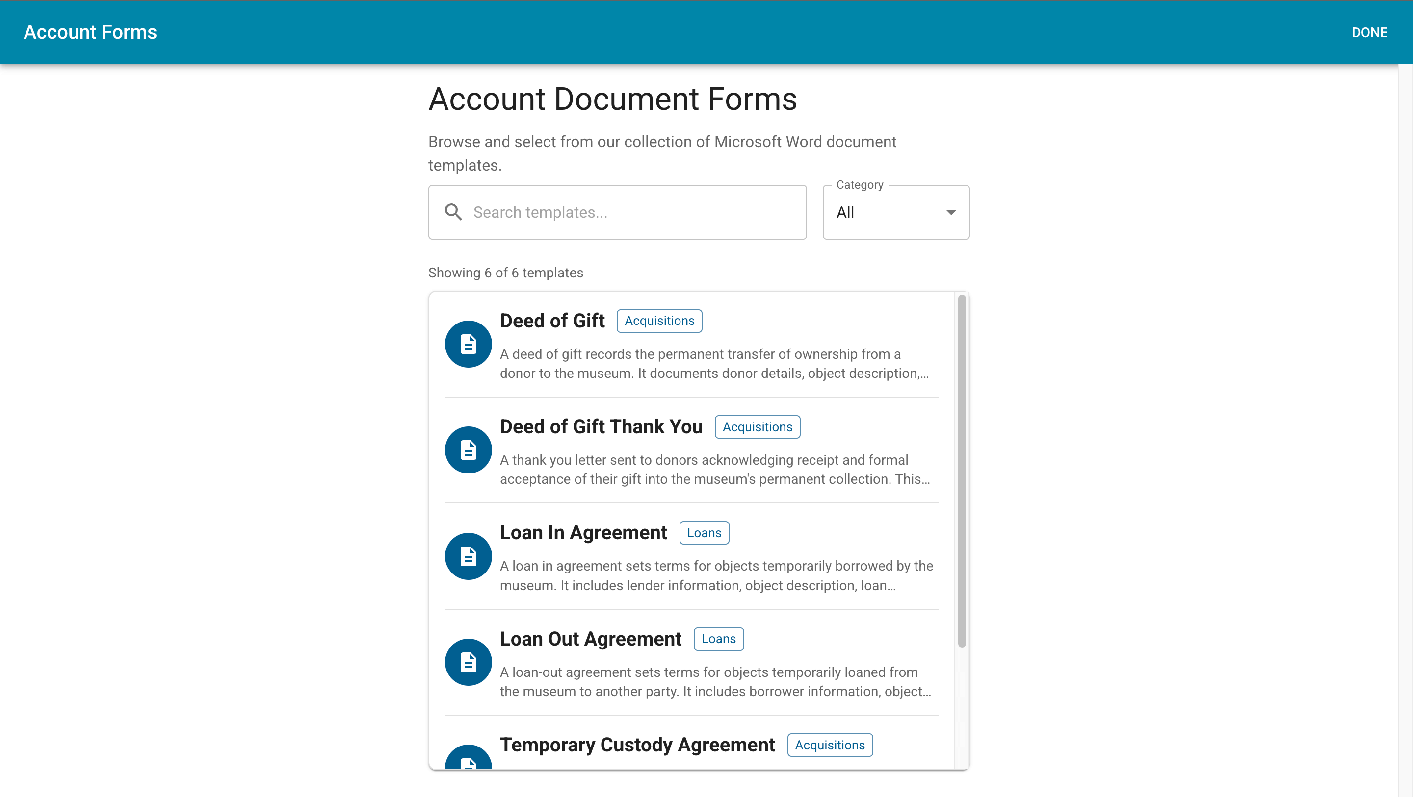 The same flexible process applies to Temporary Custody Agreements. Use the information available in the profile and object record to generate the form, then edit as needed to add missing details. You can also leave space on the document for the depositor to complete or update once the object is in hand. In each case, CatalogIt enables you to create clear, professional forms using the information you already have, without starting from scratch.